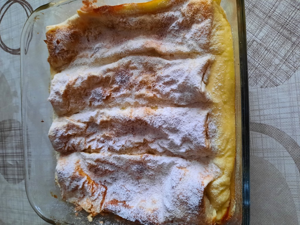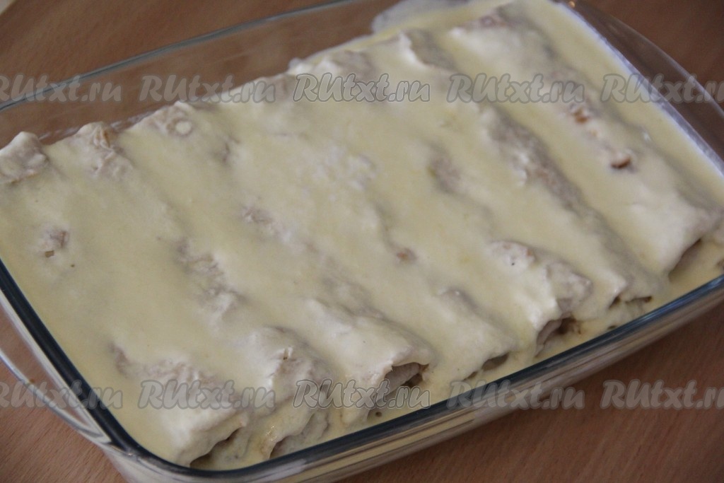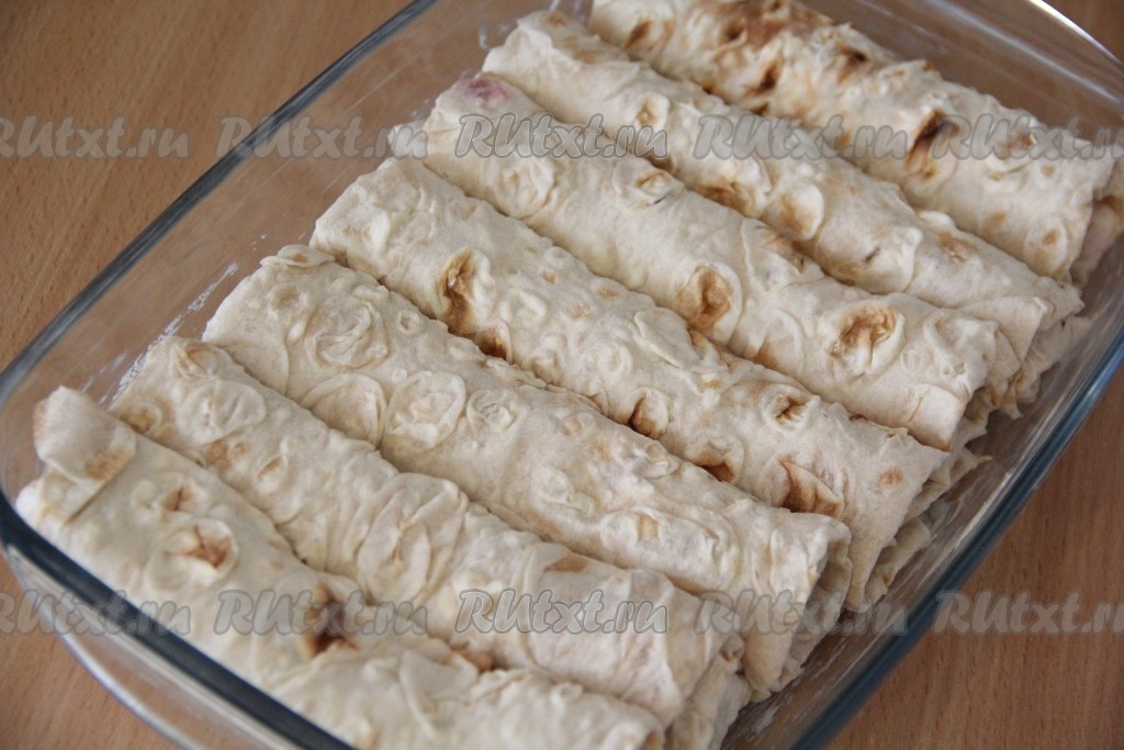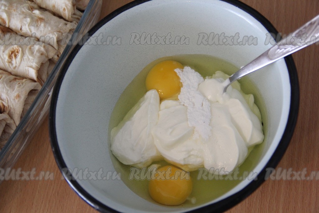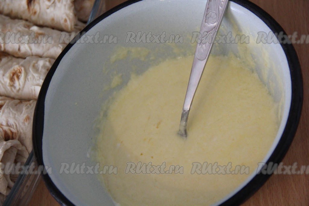 Вылить получившуюся смесь поверх рулетиков из лаваша с творогом. Поставить форму в разогретую духовку и запекать при 200 градусах, примерно 30 минут, до золотистой корочки.