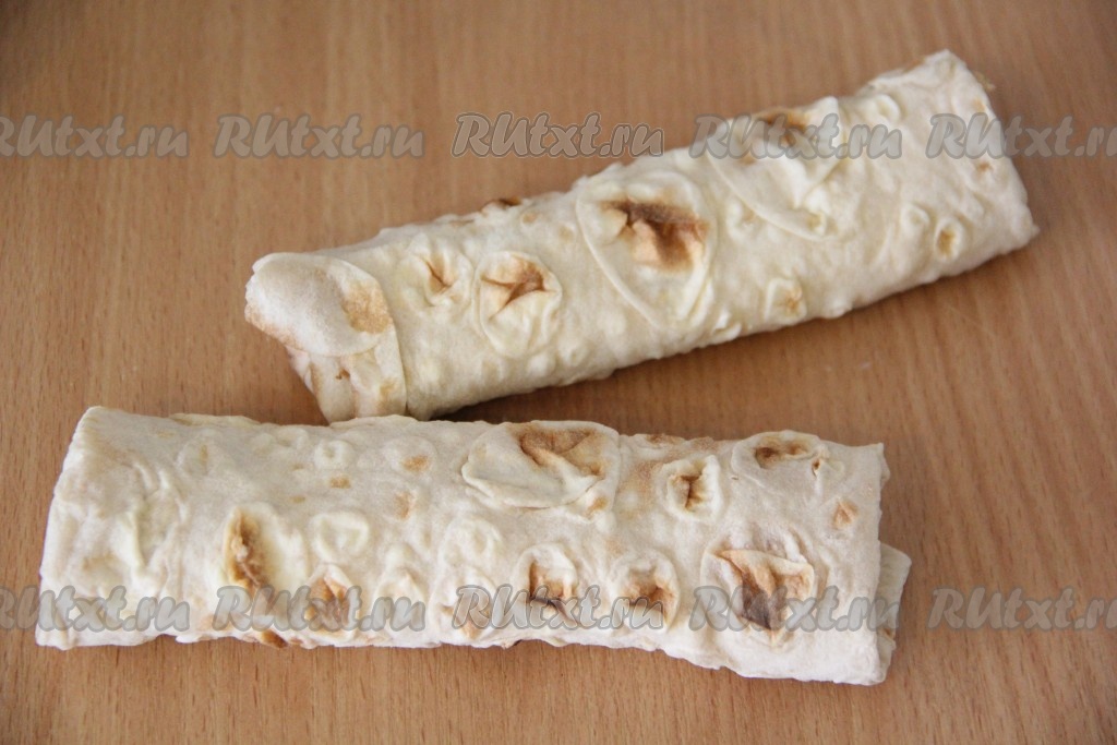 Завернуть начинку в лаваш в виде плотного рулетика.