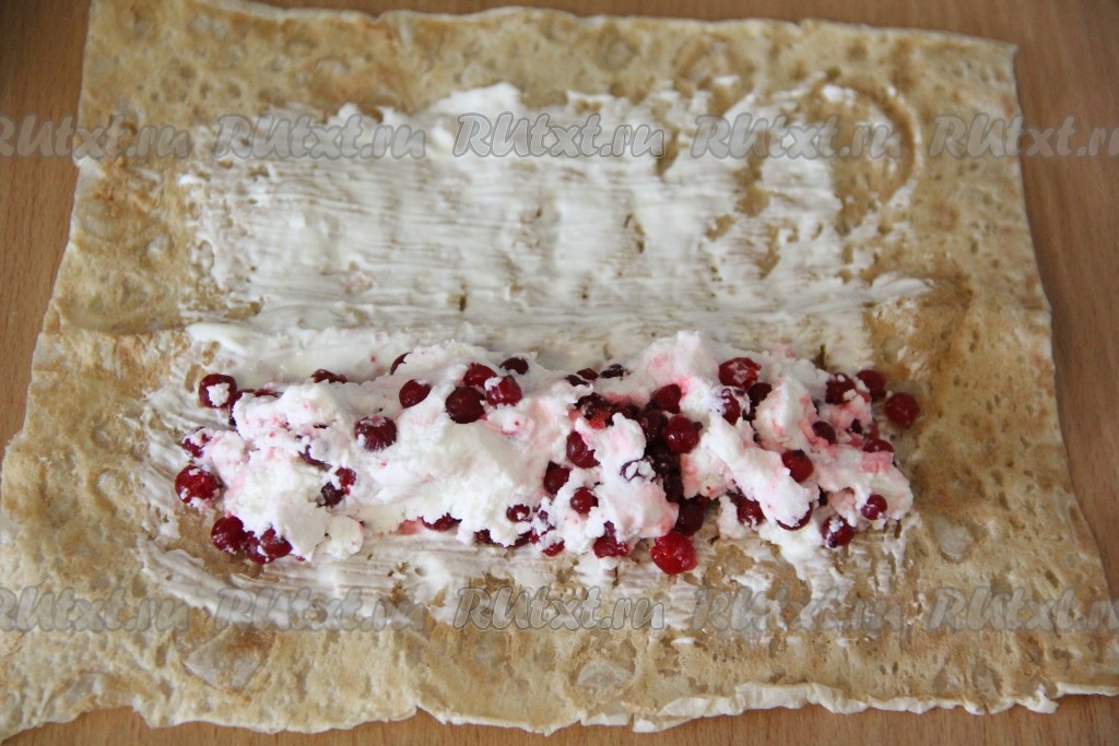 Остудить и перед подачей щедро посыпать сахарной пудрой и украсить свежими ягодами наивкуснейший лаваш с творогом, запеченный в духовке.