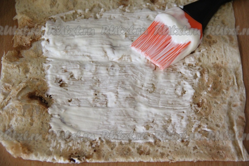 Лаваш нарезать на квадратики. Смазать серединку лаваша сметаной.