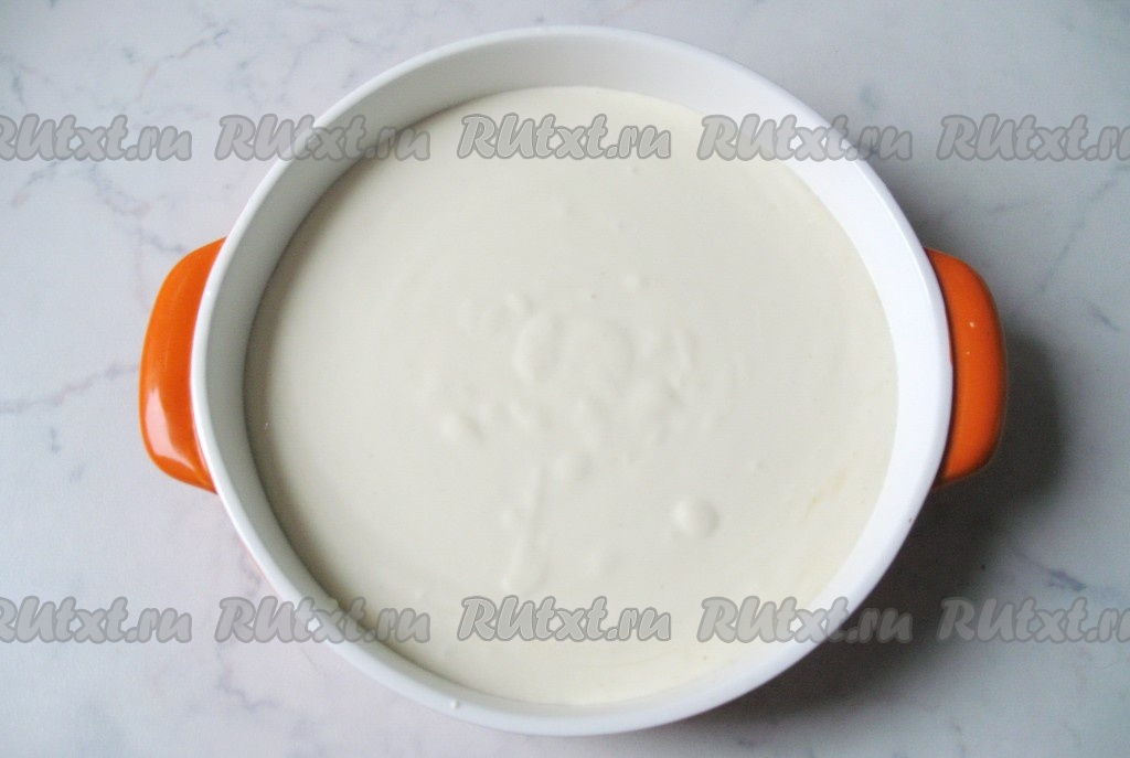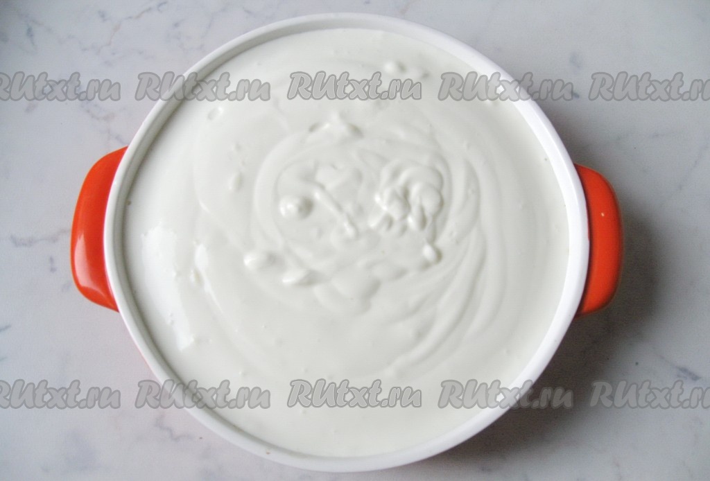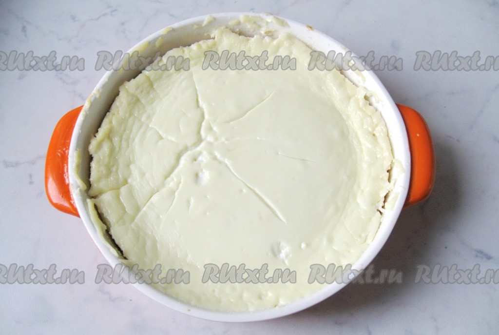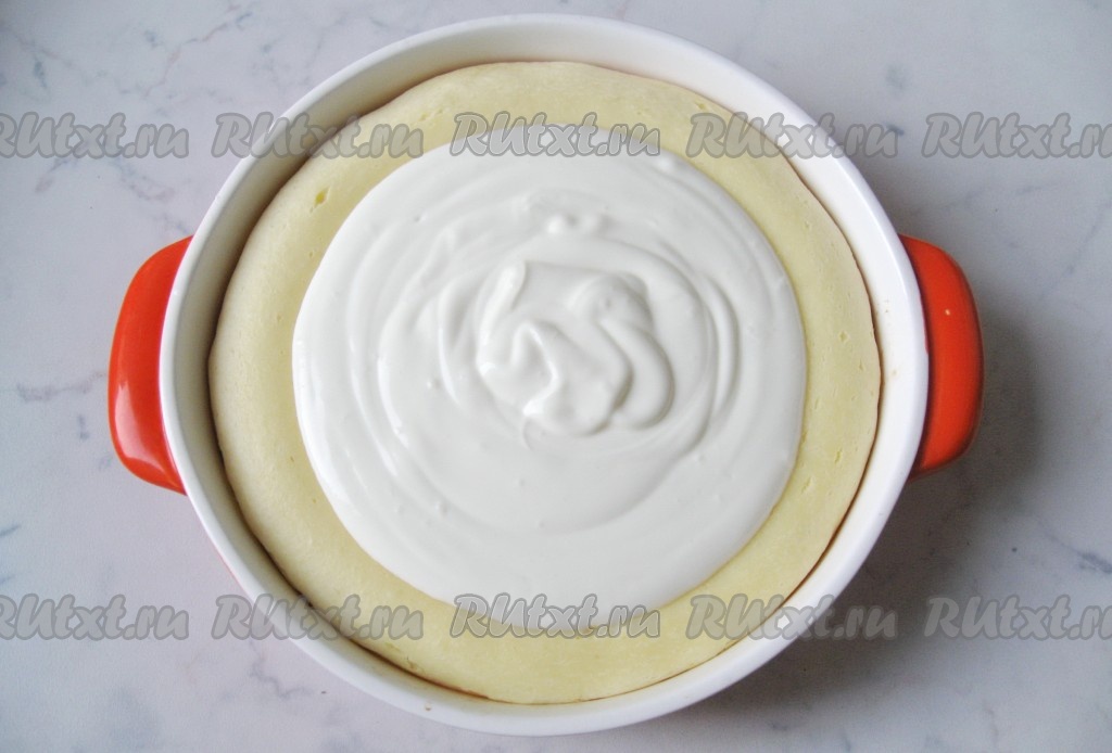 Выложить сметану с сахарной пудрой на творожную запеканку.