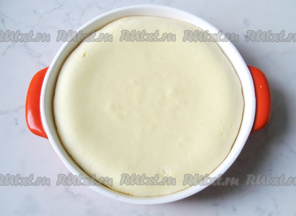 Яйца с сахаром, ванильным сахаром, солью, творогом и манной крупой перемешать и взбить блендером. Это обязательно, иначе запеканка не будет достаточно нежной и однородной. Смазать форму для запекания сливочным маслом, вылить эту смесь в форму и поставить в разогретую духовку.