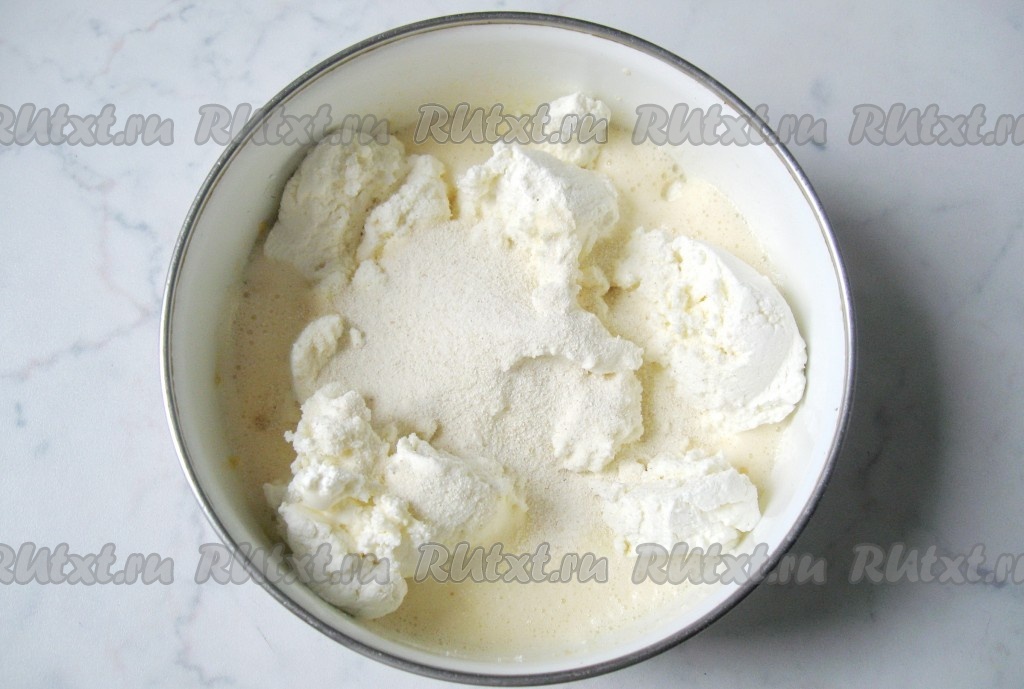 К яйцам с сахаром добавить творог, соль, ванильный сахар и манную крупу.