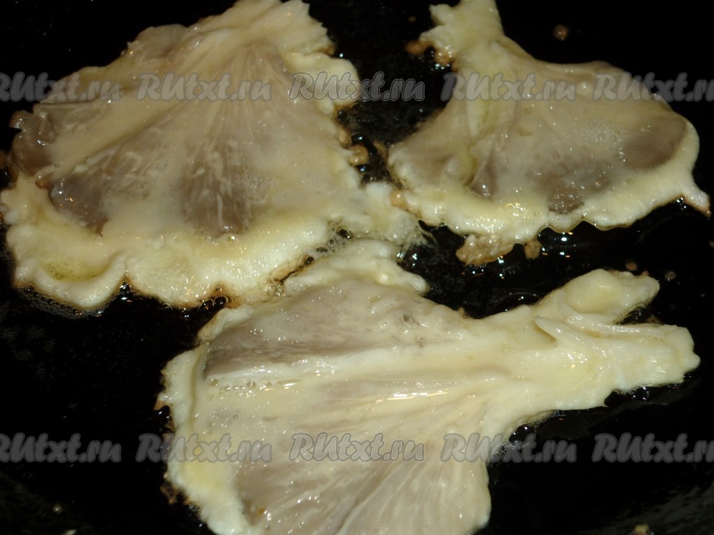 Жарить вешенки в кляре на среднем огне с двух сторон до румяной корочки (приблизительно по 1-2 минуте с каждой стороны).