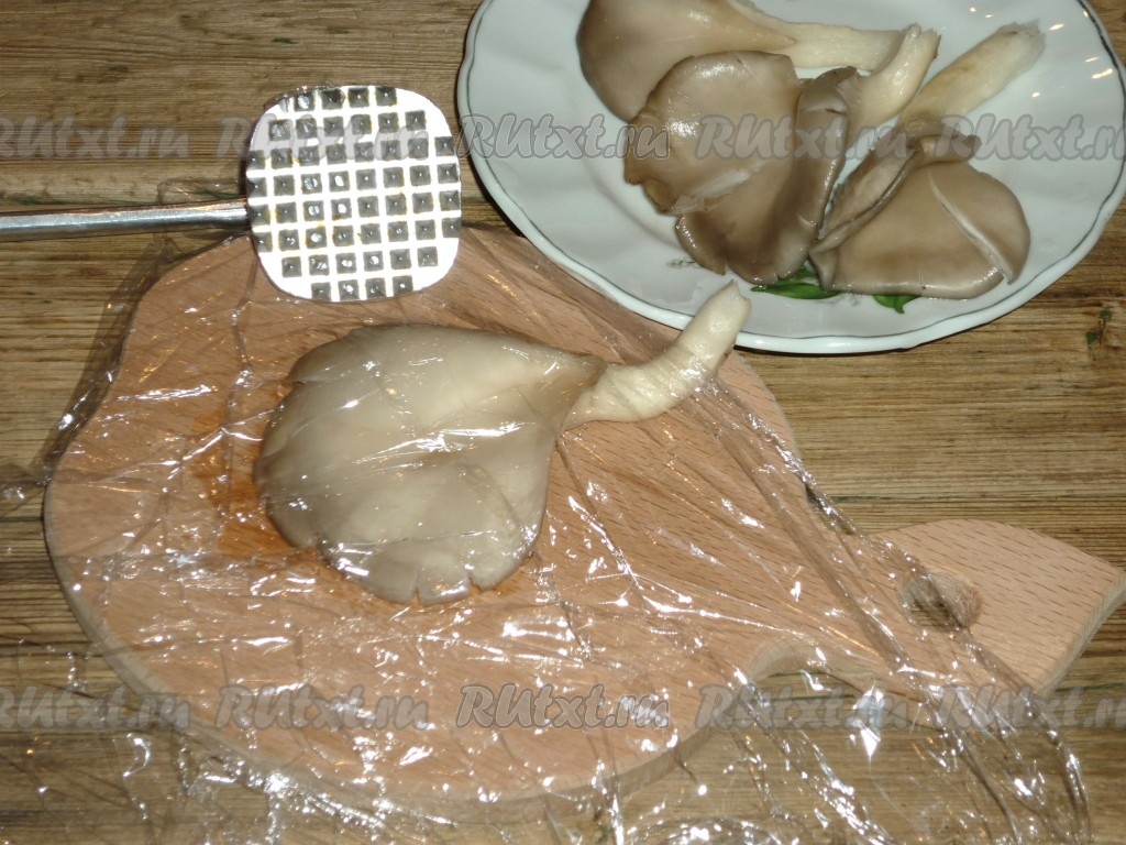 Вешенки промыть под проточной водой, обсушить. Разделить грибочки. Каждый гриб накрыть пищевой плёнкой, осторожно отбить молоточком для отбивных, посолить и поперчить по вкусу.