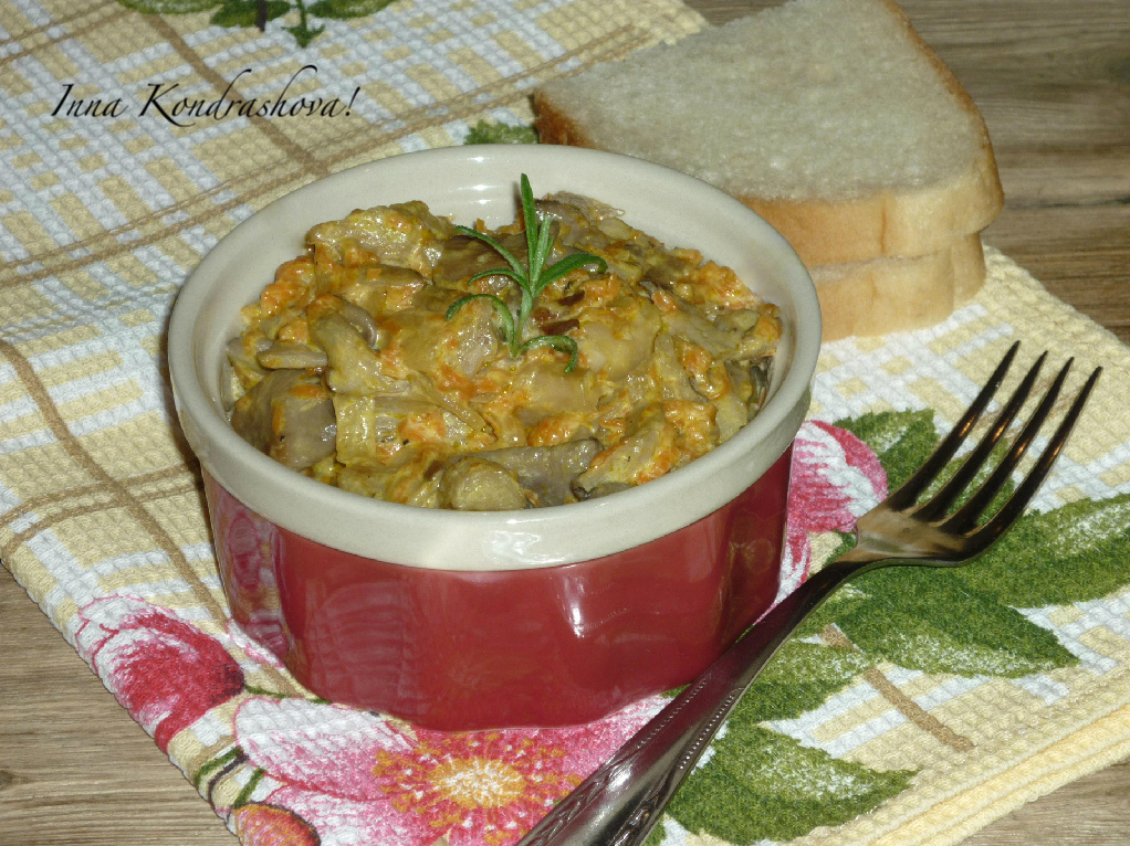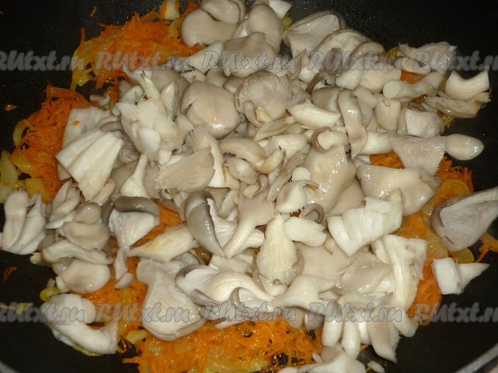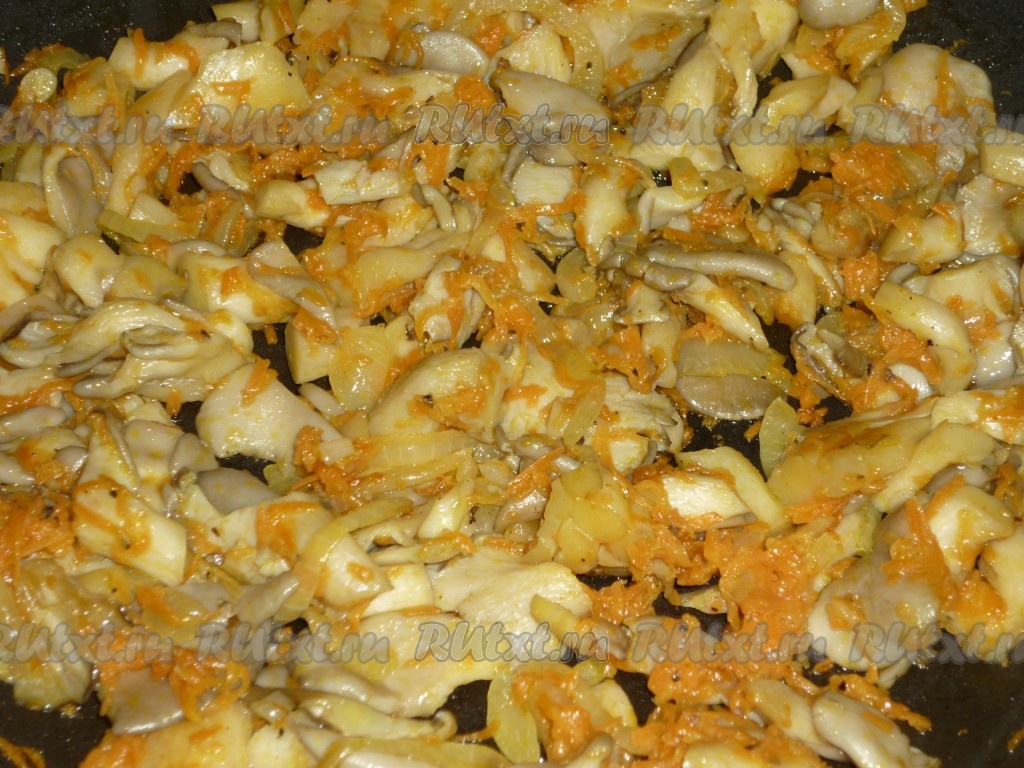 Лук с морковкой обжарить на сковороде на растительном масле в течение 4-5 минут (до мягкости морковки) на среднем огне, не забывая помешивать. Вешенки нарезать на кусочки среднего размера (очень мелко резать не стоит, так как грибы ужариваются). Добавить вешенки на сковороду к обжаренным овощам, перемешать. Когда грибы пустят сок, поперчить и посолить по вкусу.