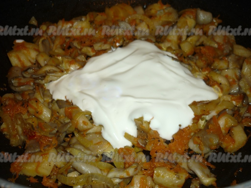 К обжаренным вешенкам добавить сметану, перемешать и тушить на небольшом огне 3 минуты.
