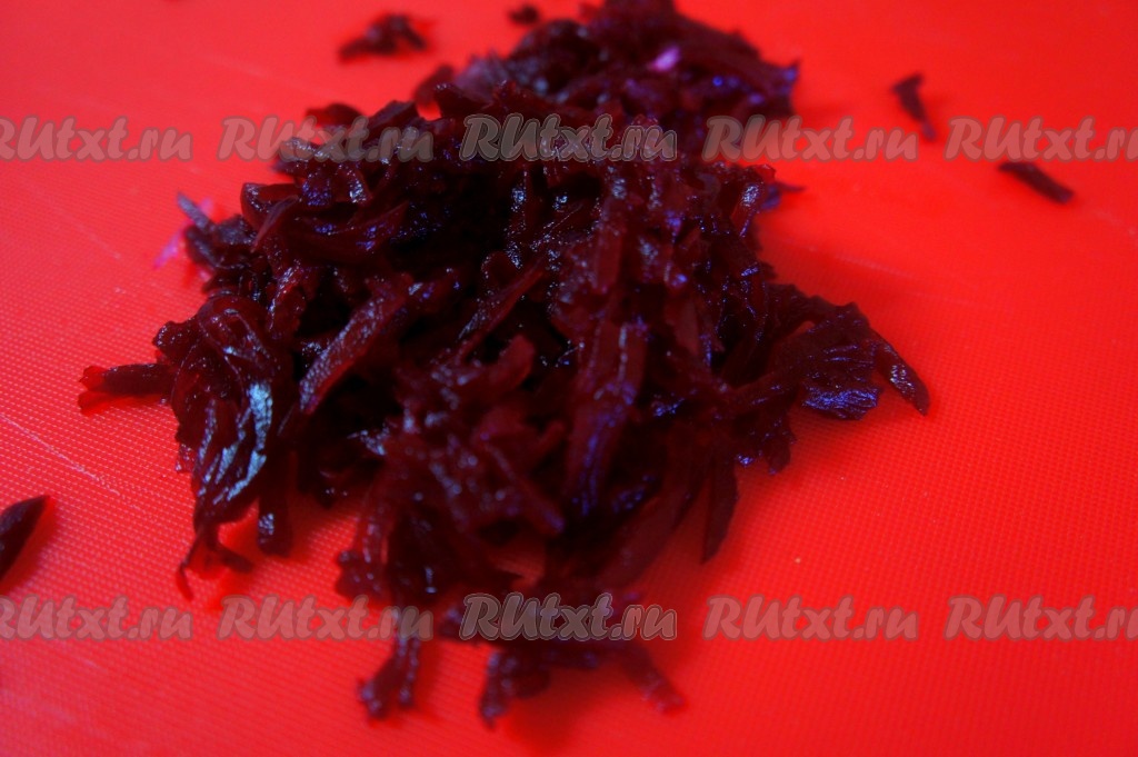 Добавить свеклу, воду. Посолить, добавить сахар, уксус. Перемешать. Дать постоять холодному борщу с колбасой 10 минут.