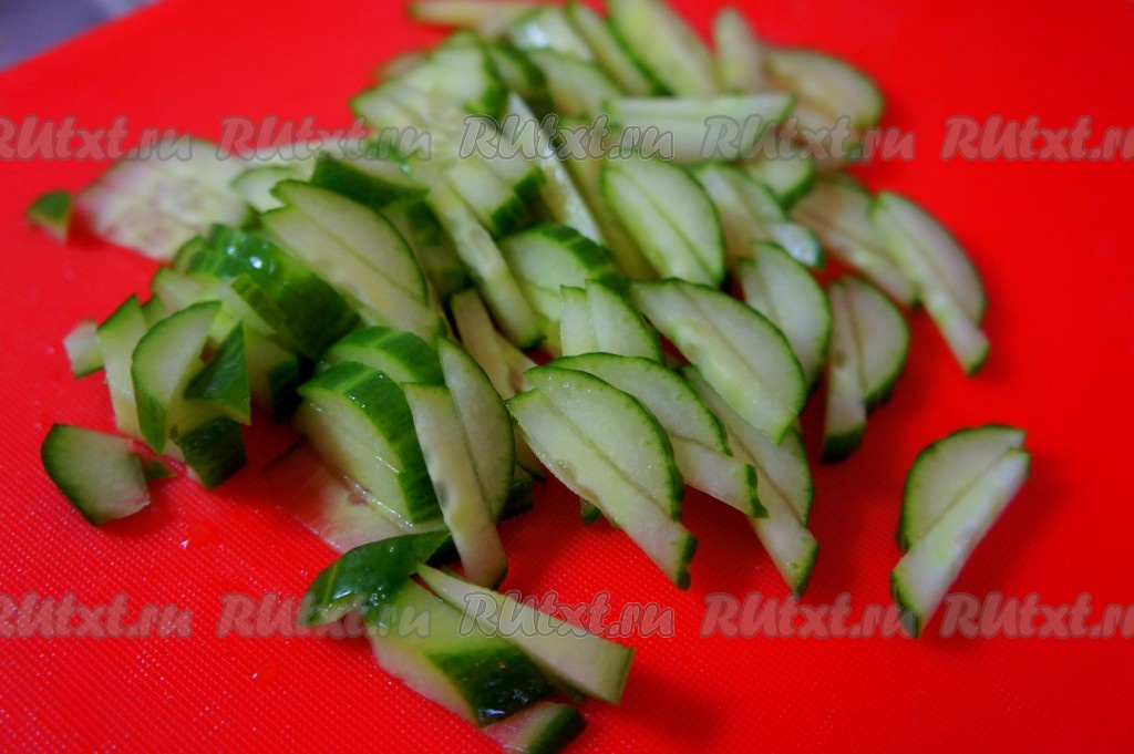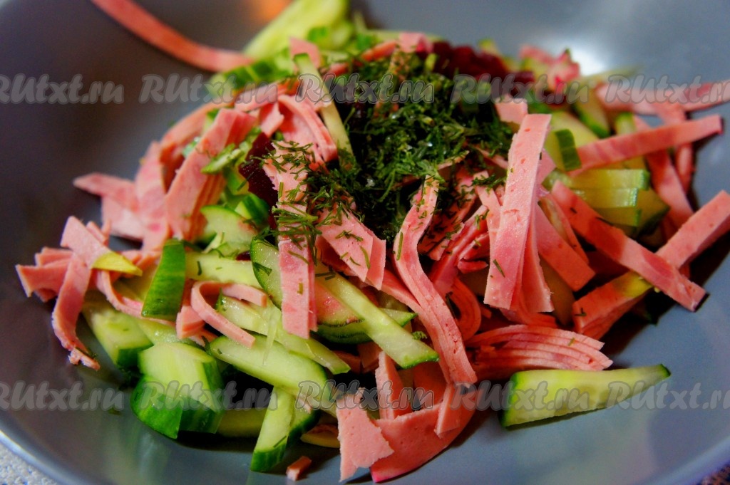 В тарелку положить нарезанные огурец и колбасу, добавить зелень.