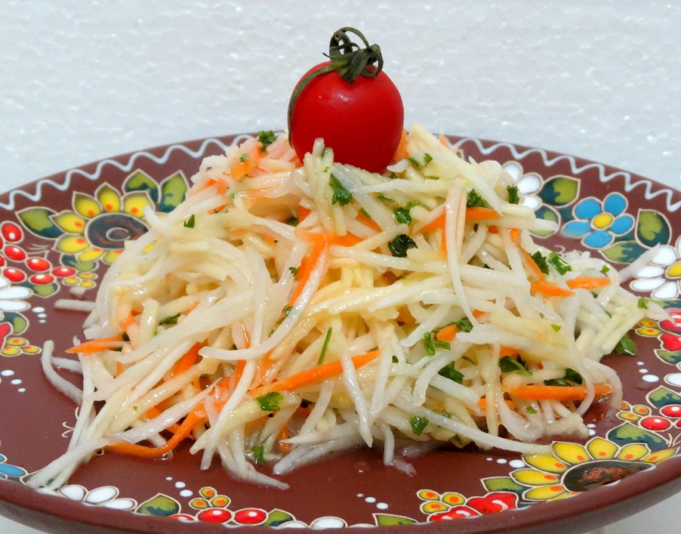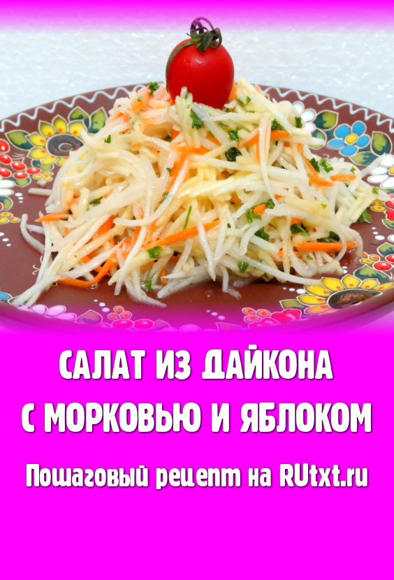 Хотите не болеть простудными заболеваниями? Периодически готовьте и кушайте салаты из редьки, тогда медицинские препараты вам не понадобятся. Сегодня мы будем готовить салат из дайкона (белой длинной редьки), моркови и яблока. Блюдо получается вкусным, сочным и очень полезным.