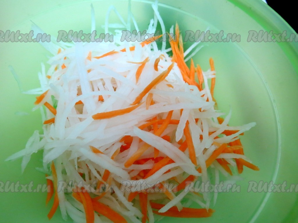 Я натёрла редьку на тёрке для корейской моркови, но можно использовать и обычную крупную тёрку.