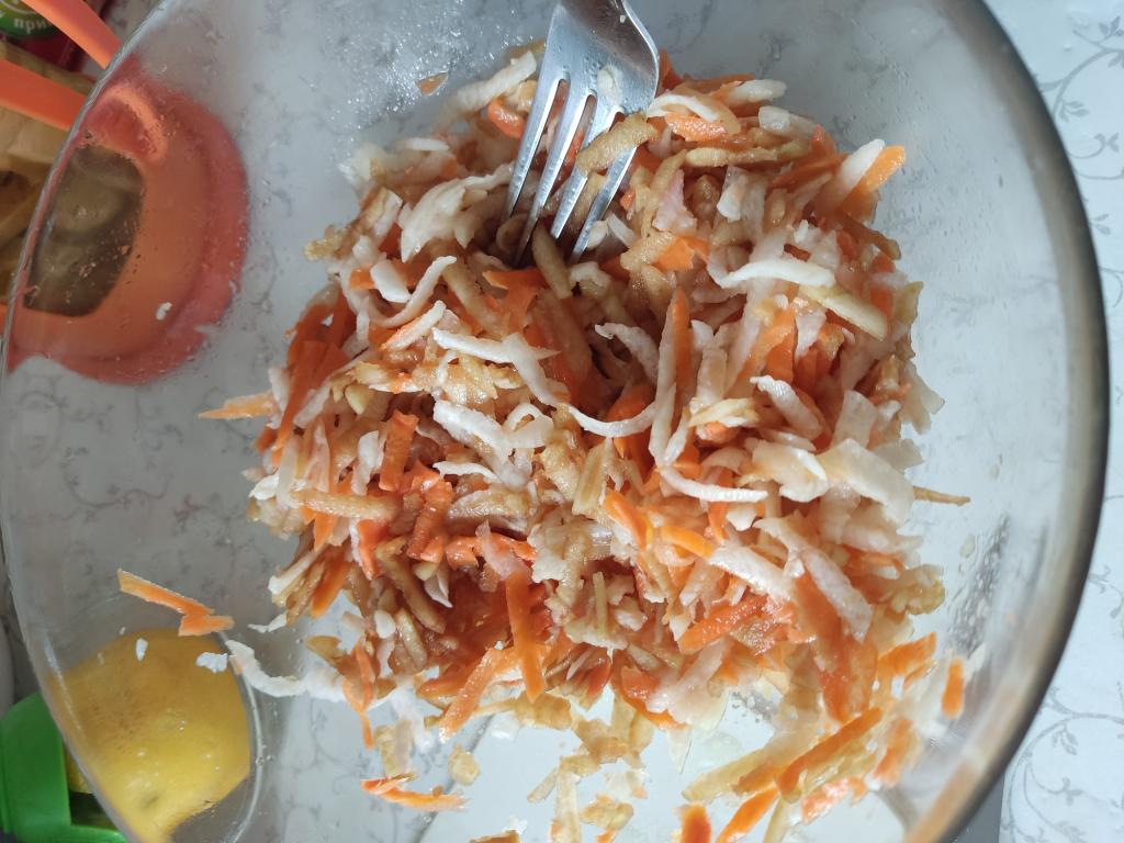 Солим, заправляем растительным маслом и соком лимона. Вкусный, сочный, полезный салат из дайкона с морковью и яблоком прекрасно разнообразит ваше меню.