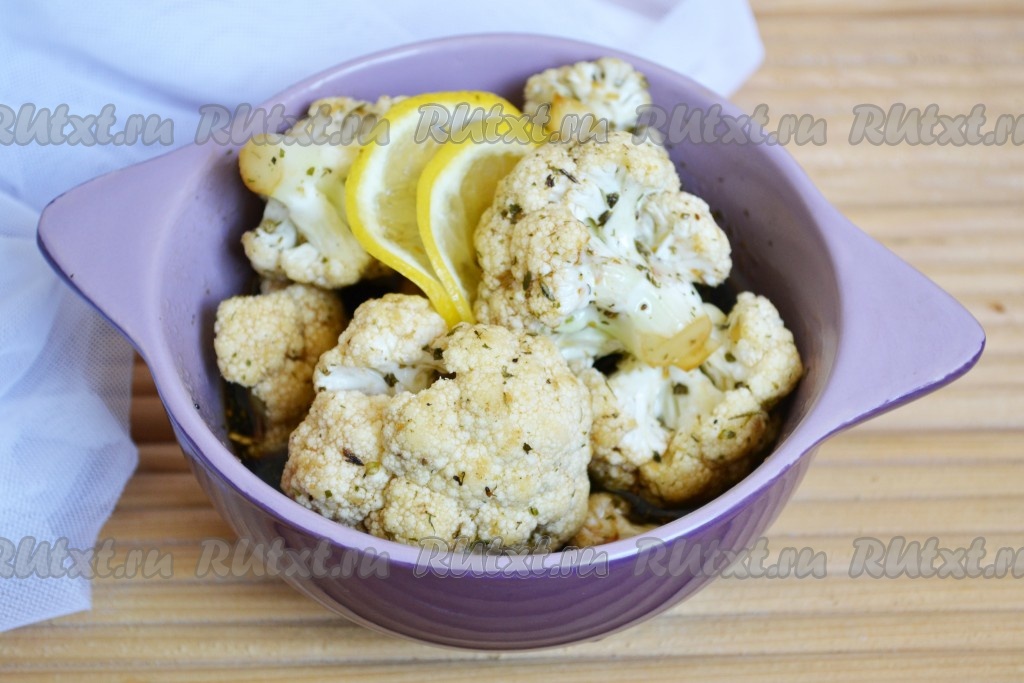 Цветную капусту моем, разделяем на соцветия, солим, посыпаем сушёными травами, перемешиваем. Добавляем оливковое масло.