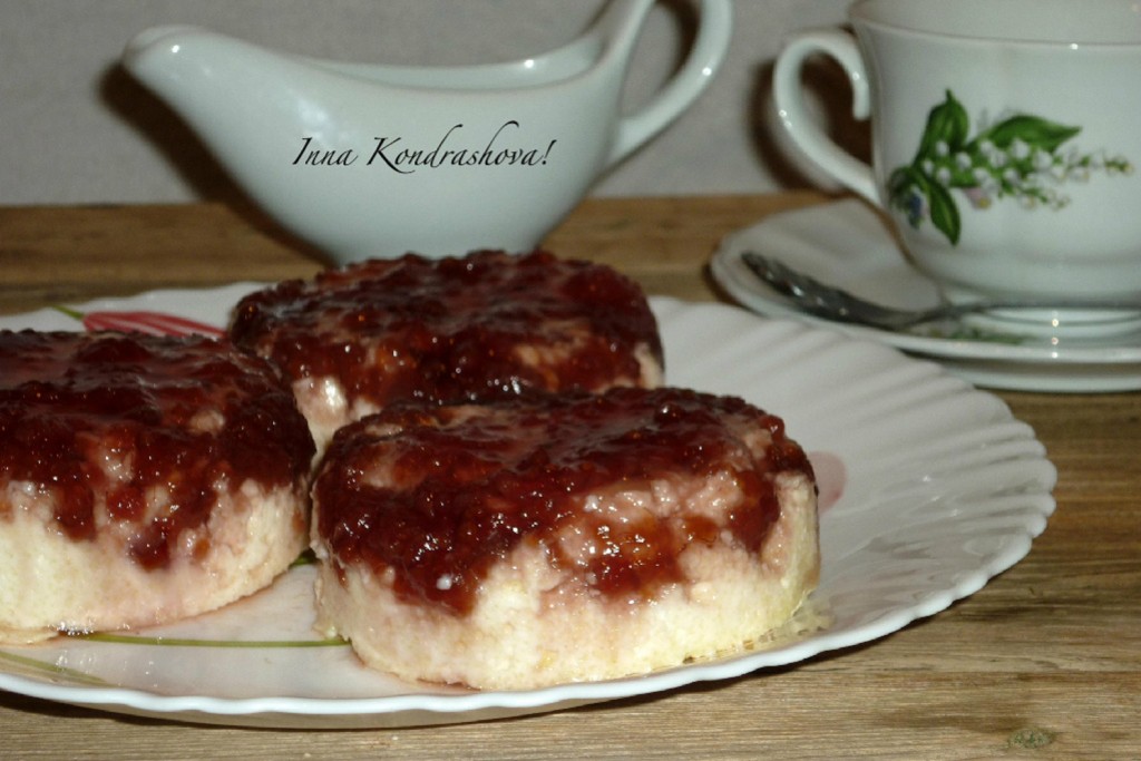 Затем вынуть формочки из духовки. Вкусные, нежные, полезные творожные запеканки немного остудить и достать из форм. Я просто переворачиваю на тарелку, чтобы слой малинового варенья был сверху. Отличным дополнением к этой выпечке станет сметана.