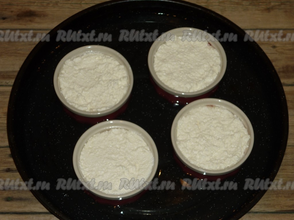 На противень поставить порционные формочки и отправить в разогретую до 150 градусов духовку.