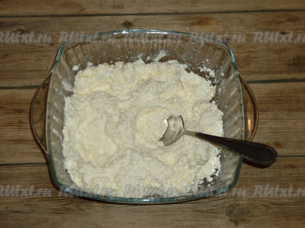 Творог выложить в объёмную ёмкость, всыпать сахар, растереть столовой ложкой до однородности. Затем всыпать манную крупу и вбить сырые яйца, перемешать до однородности столовой ложкой (или можно пробить погружным блендером).