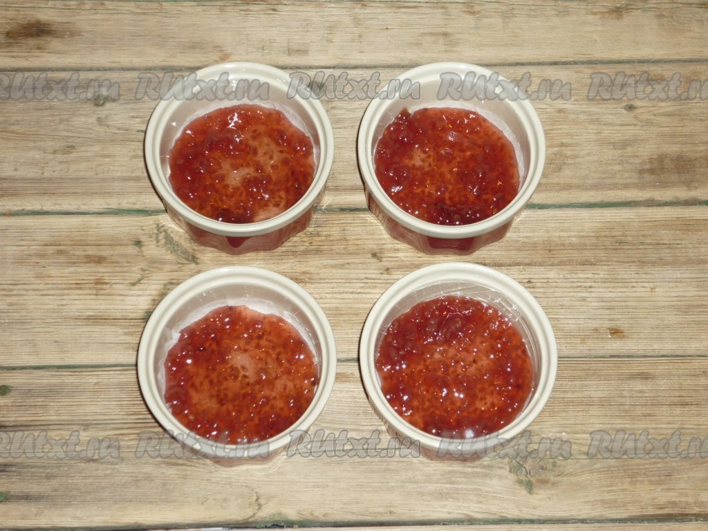 На дно каждой формы выложить по 1,5 столовых ложки малинового варенья.