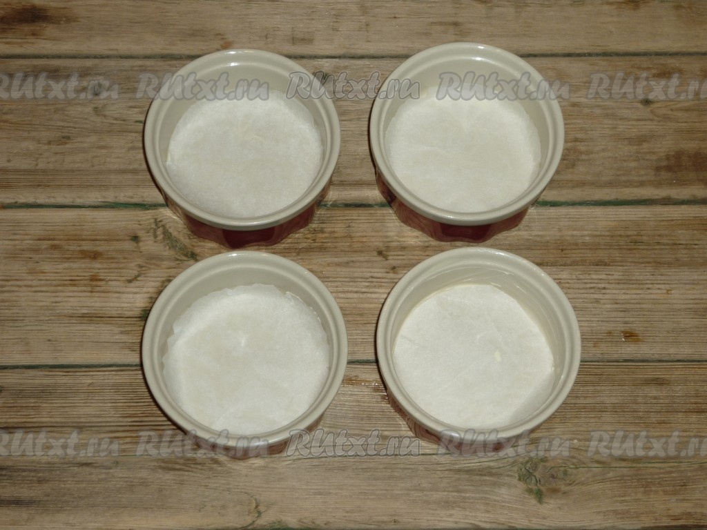 Такую творожную запеканку можно приготовить в одной большой форме или сделать порционную подачу. Я сделала порционный вариант. Дно жаропрочных порционных форм (или одной большой формы) застелить пергаментом, затем бока форм и пергамент смазать сливочным маслом.