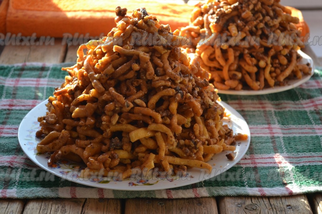 Орехи почистить, порубить (не очень мелко). В приготовленный сироп добавить орехи, перемешать. Жареные полоски теста выложить в достаточно объёмную ёмкость, залить горячим медовым сиропом с орехами.