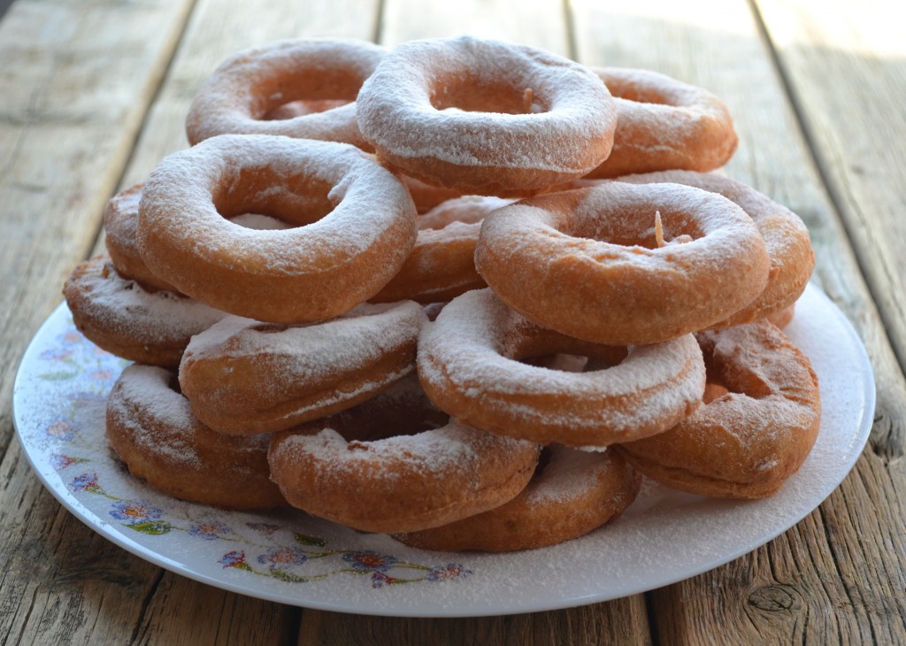 На столе, присыпанном мукой, раскатываем тесто до толщины приблизительно 1 сантиметр и вырезаем с помощью чашки кружочки или бублики. Я сделала пончики и в форме кружочков, и в форме бубликов.