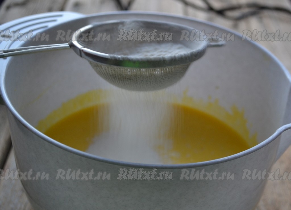 Частями всыпаем просеянную муку, каждый раз полностью вмешивая её в творожное тесто.