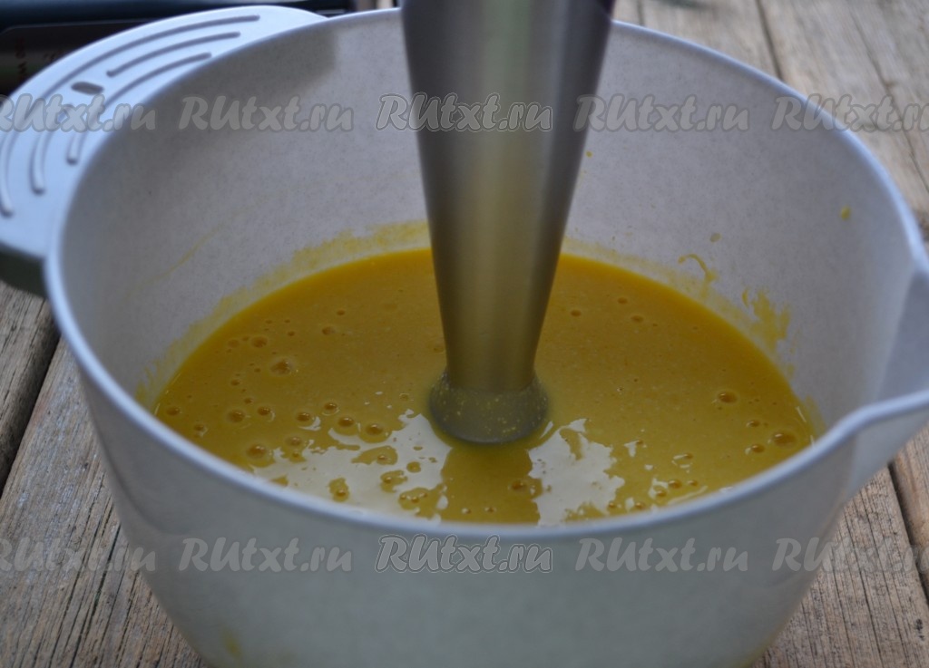 Получившуюся творожную массу пробиваем при помощи погружного блендера до однородности.