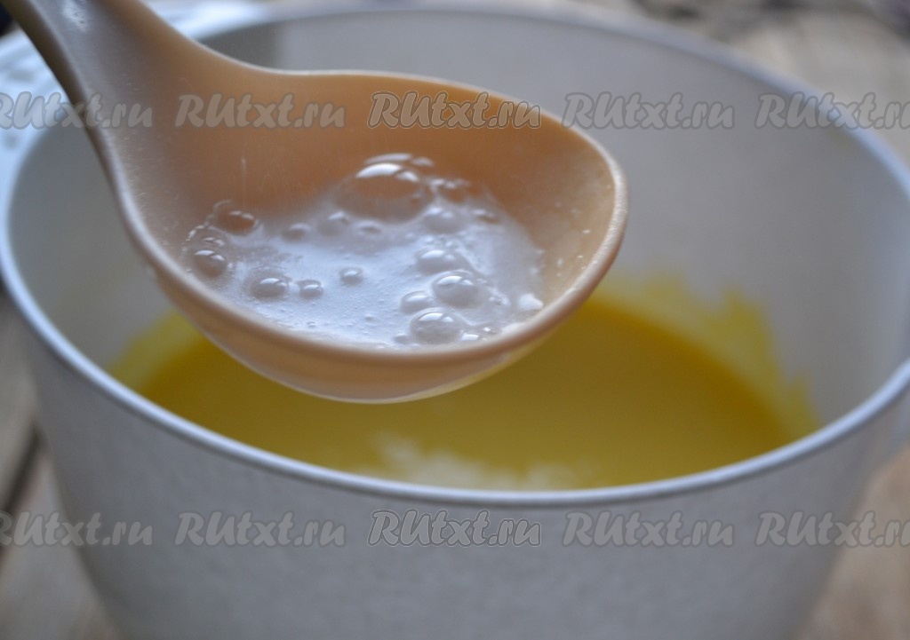В творожную массу добавляем соду, погашенную уксусом, перемешиваем.