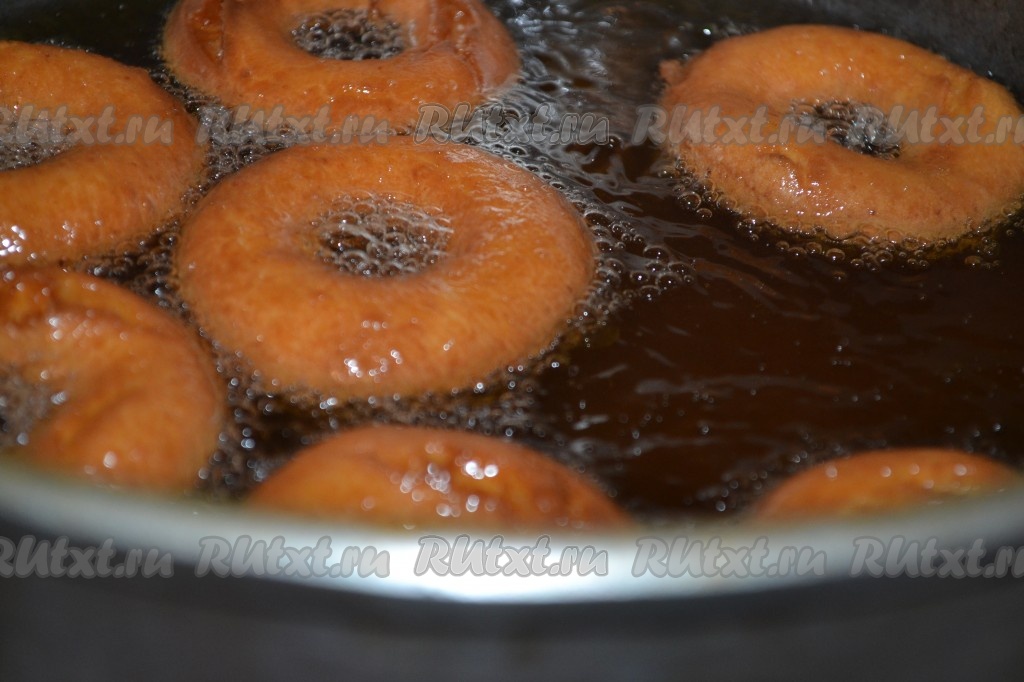 В глубокой сковороде (или в кастрюле с толстым дном) разогреваем достаточно большое количество подсолнечного масла (фритюр), огонь уменьшаем до среднего. Затем выкладываем несколько заготовок творожных пончиков и жарим их с двух сторон до золотистости.