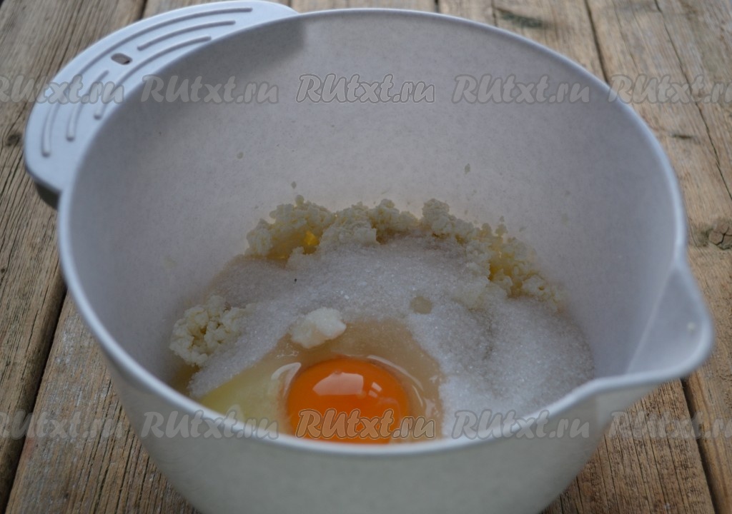 В объёмную миску кладём творог.