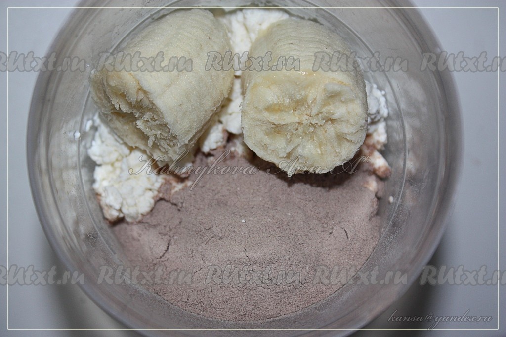 Творог, протеин (или казеин) и банан положить в чашу.
