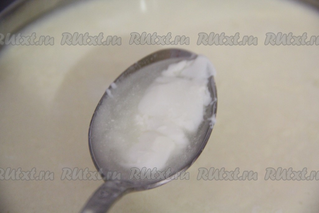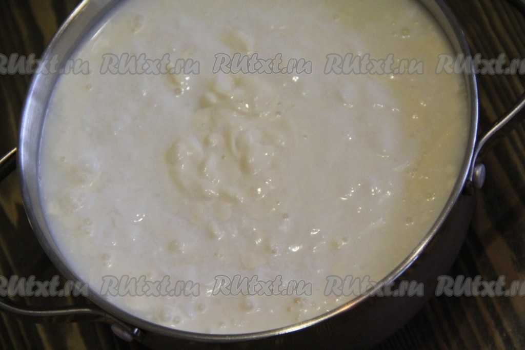 Пока молоко закисает, перемешивать его не надо. Молочная масса станет плотной, сверху образуются пузырьки. Как только молоко скиснет, слегка перемешать молочную массу.