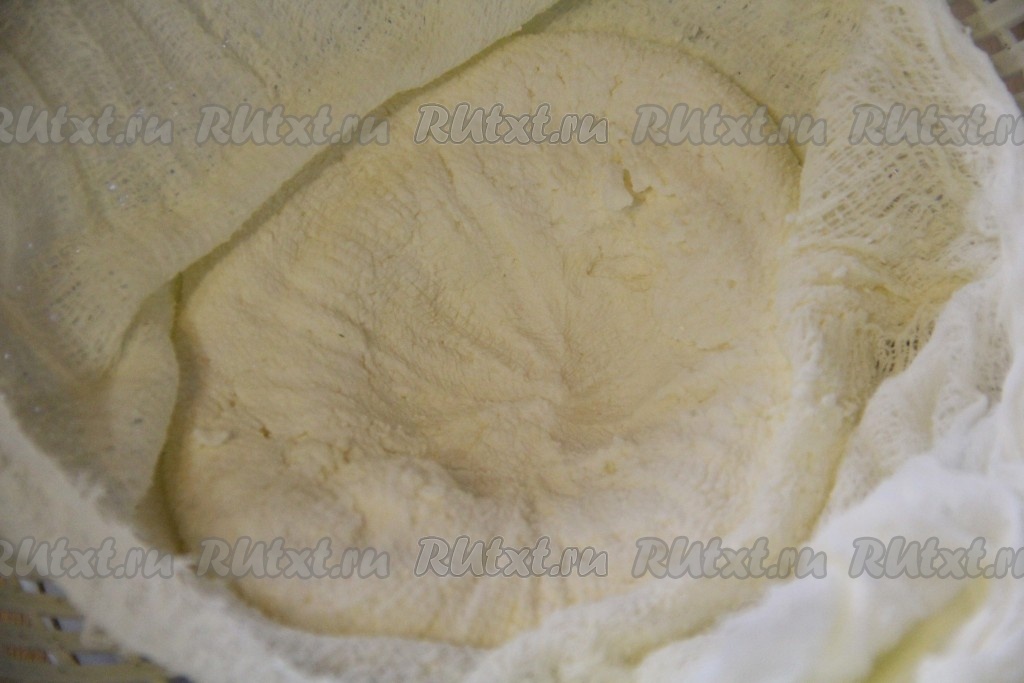 На некоторое время оставить марлю с творогом на дуршлаге, чтобы стекла лишняя сыворотка, а затем завязать марлю узлом, а сверху поставить груз.