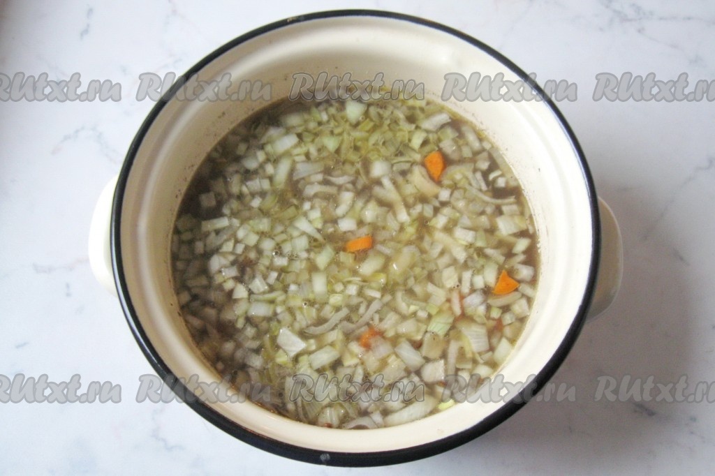 В кастрюлю с бульоном (у меня куриный) выложить зеленую чечевицу, довести до кипения и снять пену. Затем огонь уменьшить и варить её до мягкости 25-30 минут. Зеленая чечевица, в отличии от красной, варится значительно дольше. Пускай вас не смущает цвет отвара чечевицы. В процессе приготовления, после добавления всех остальных ингредиентов, суп приобретет золотисто-коричневый оттенок, напоминающий грибной, и будет выглядеть вполне аппетитно.