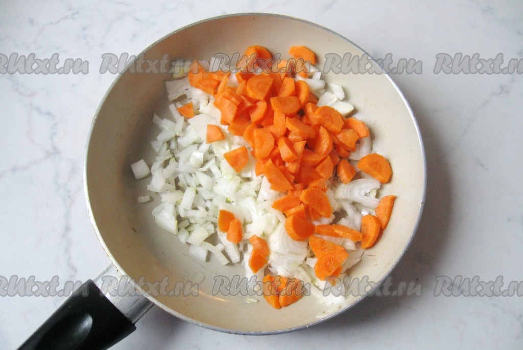 Лук репчатый и морковь почистить, помыть и мелко нарезать. Обжарить на сковороде с подсолнечным маслом в течение 10 минут, не забывая помешивать.