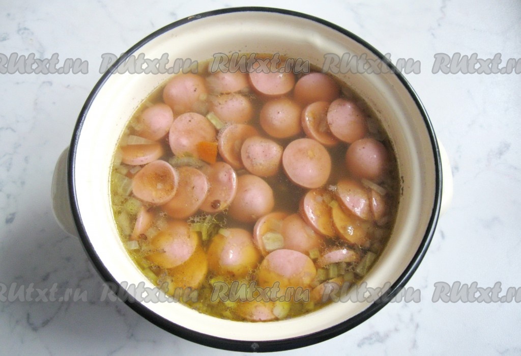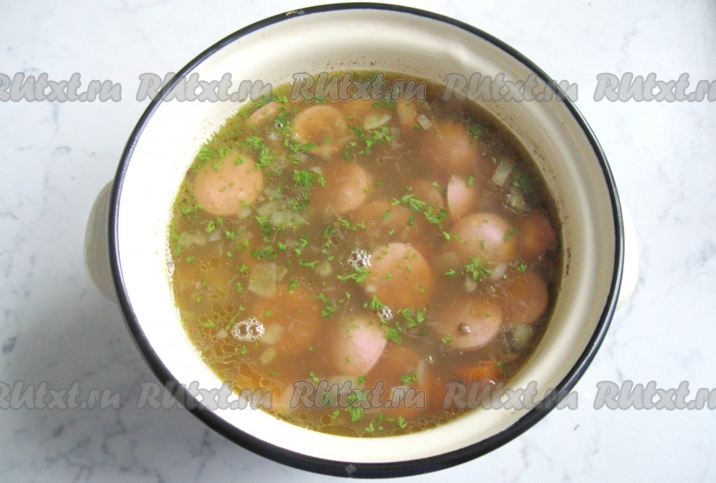 Когда овощи в супе с чечевицей будут готовы, добавить в кастрюлю нарезанные сосиски и варить еще 5-7 минут. Суп посолить и поперчить по вкусу.