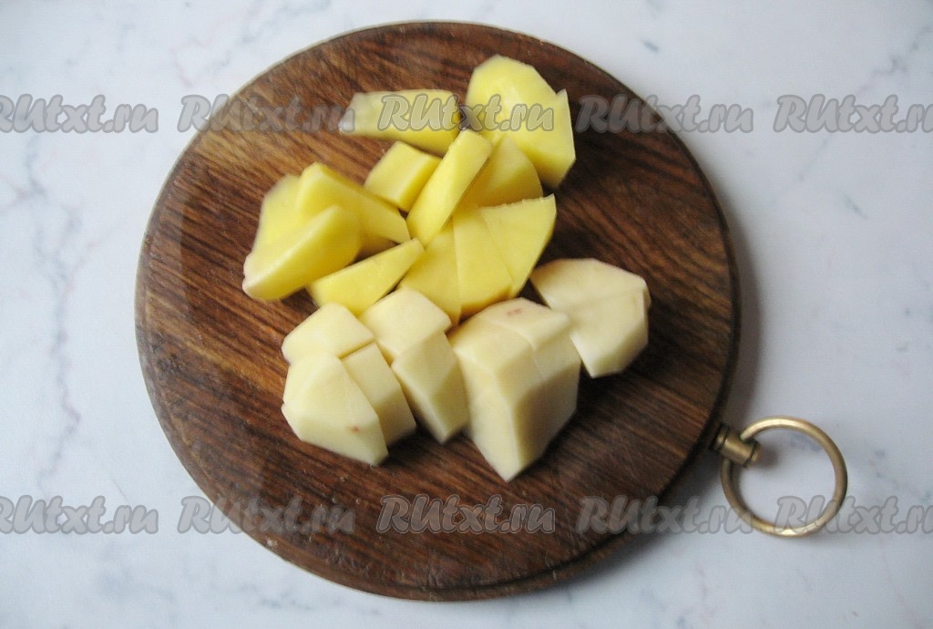 Картофель почистить, помыть и нарезать кубиками. Когда зелёная чечевица сварится, добавить картошку в кастрюлю с супом.