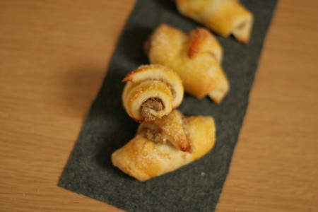 На каждый треугольник положить немного ореховой начинки и свернуть рогалик от основания к вершине.