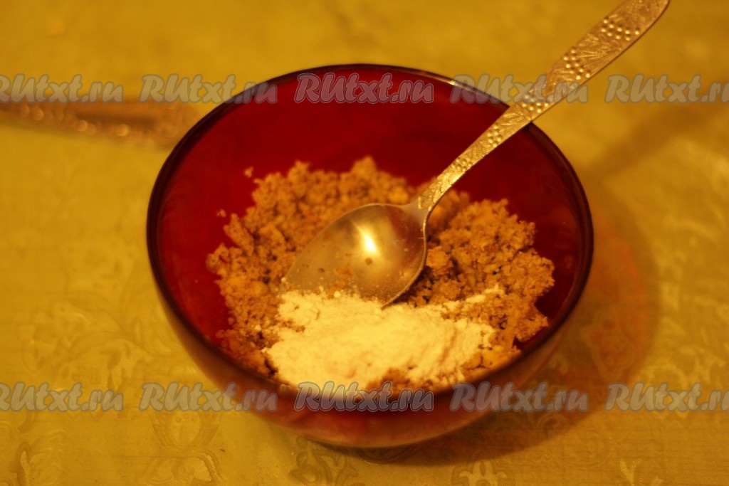 Грецкие орехи измельчить в блендере или кофемолке (крупинки по размеру должны соответствовать сахарному песку), перемешать с сахарной пудрой, залить кипящим молоком и растереть до получения довольно густой массы.