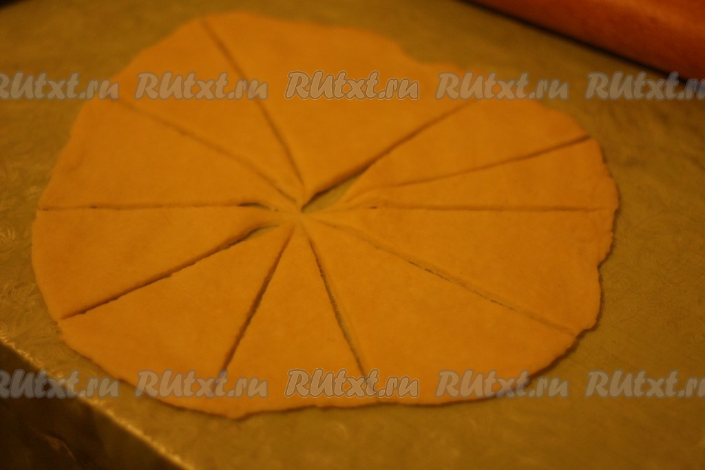 Тесто раскатать в круг толщиной около 0,5 см, разделить его на треугольники.