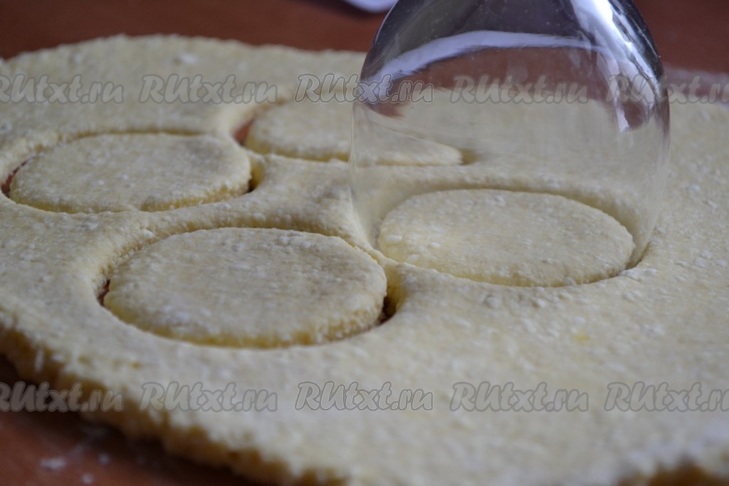 Стол немножко припорошить мукой и раскатать тесто толщиной приблизительно 5 миллиметров. Вырезать круги желаемого диаметра с помощью соответствующего стакана.