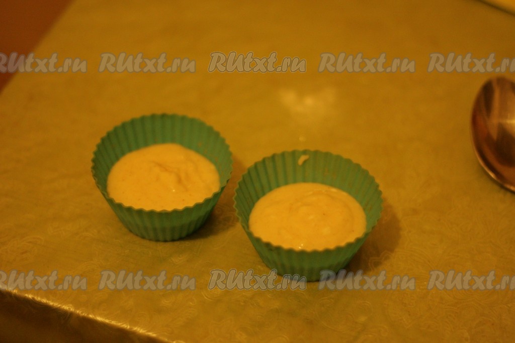 Тесто должно получиться, как густая сметана. Выливаем тесто в формочки.