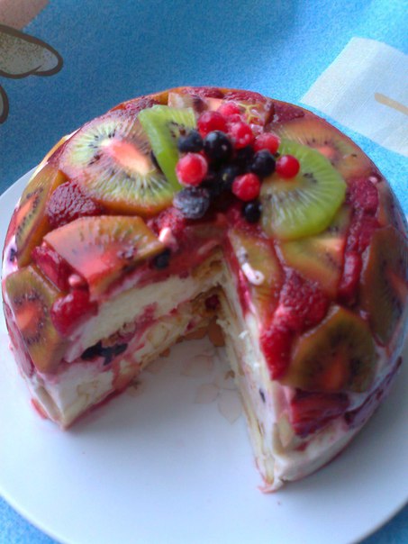 Надеюсь, вам понравится и приятно удивит простой рецепт приготовления фруктово-бисквитного торта с желатином.