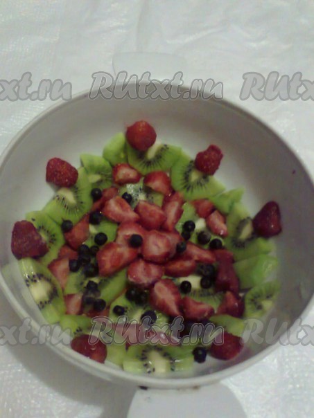 Далее в небольшую ёмкость всыпать желатин, залить 125 миллилитрами (половиной стакана) молока или чистой холодной воды и оставить минут на 30, чтобы желатин набух. Сметану поместить в миску, добавить сахар и взбить миксером до полного растворения сахара. Набухший желатин поставить на водяную баню и, помешивая, довести его до полного растворения, не давая ему закипеть. Не переставая взбивать сметану с сахаром, тонкой струйкой влить желатин, взбивать сметанный крем ещё около полминуты. Дно глубокой миски (у меня - супница) застелить пищевой плёнкой (я не застилала, но лучше застелить). Фрукты и ягоды вымыть, очистить от кожуры и косточек, яблоки и клубнику нарезать на мелкие кусочки, киви нарезать на кружочки или полукружочки (немного оставить для украшения верха торта). Бисквит тоже нарезать на кусочки размером 1,5х1,5 сантиметра. Выложить киви и клубнику (или другие ягоды, например, смородину, чернику) на дно и бока миски.