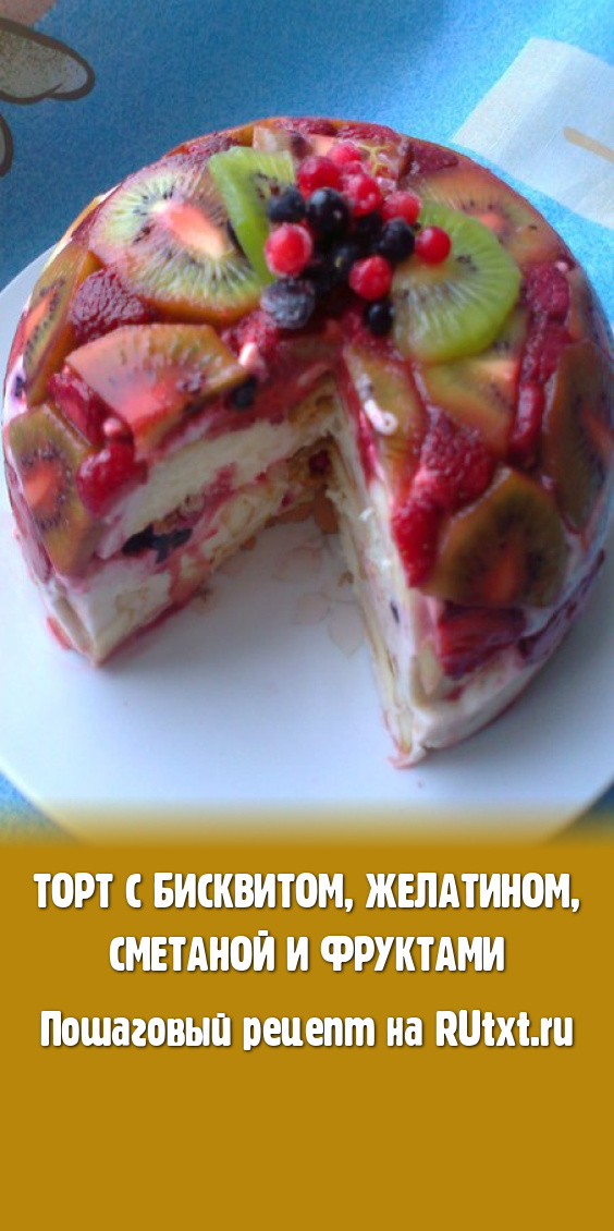 Предлагаю приготовить торт из кусочков бисквита, смешанных с желатином, сметаной и фруктами. Такой торт выглядит нарядно, готовится просто и получается вкусным. Если нет времени печь бисквит, можно купить готовый. Яркий, аппетитный фруктово-бисквитный торт с желатином украсит и семейное чаепитие, и праздничный стол.