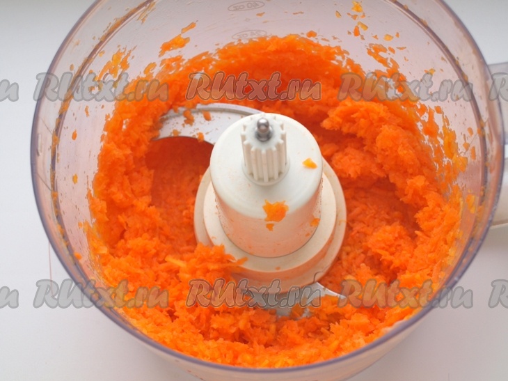Очищенную тыкву измельчить на мелкой тёрке, используя комбайн (или натереть на мелкой тёрке).