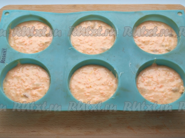 Разложить тыквенное тесто по формочкам, заполняя их на 2/3 объёма (я использовала силиконовые формочки, поэтому не смазывала их маслом перед выкладыванием теста, если будете готовить в железных формочках, тогда перед выкладыванием теста смажьте их маслом).