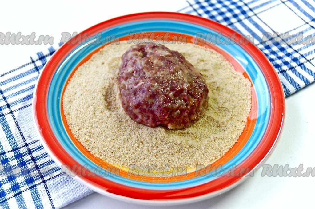 Из фарша сформировать котлеты нужного размера и обвалять в панировочных сухарях.