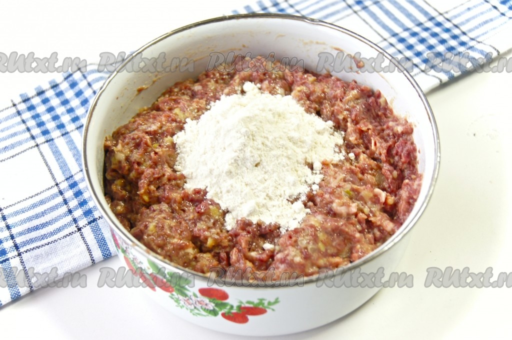 Добавить муку (муки может понадобиться чуть больше или меньше, зависит от консистенции фарша), хорошенько перемешать. Миску с фаршем накрыть пищевой пленкой и поставить в холодильник на 30 минут.