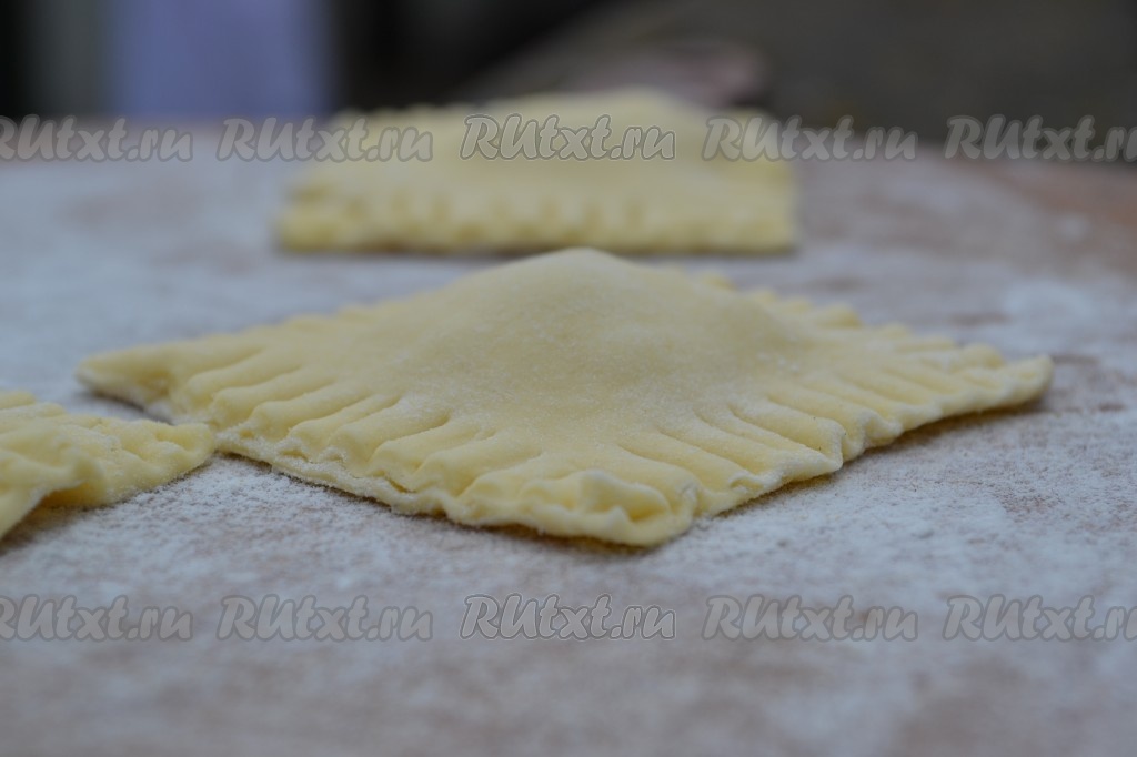 Сверху накрыть второй частью теста. Разрезать на квадратики с начинкой по середине (будущие равиоли) и защепить края теста при помощи вилки.