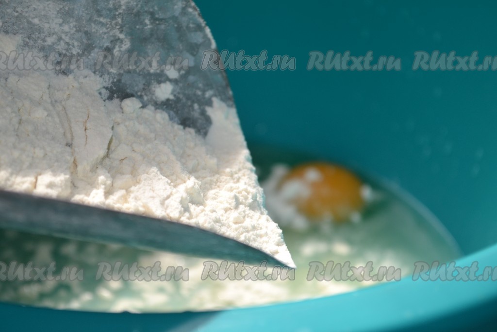 Вбить яйца, добавить воду, соль и растительное масло. Перемешать и частями добавить муку.